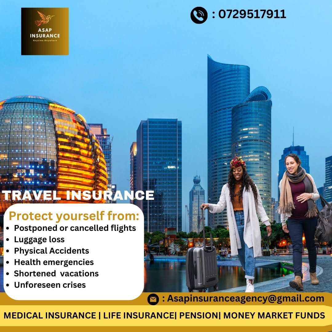 Whether traveling for bussiness or vacation, travel insurance is crucial factor to take into account. Asap Insurance Agency has affordable travel insurance policies that cover both domestic travel in Kenya and internationally, which lets you enjoy your travel experiencies without worrying.
